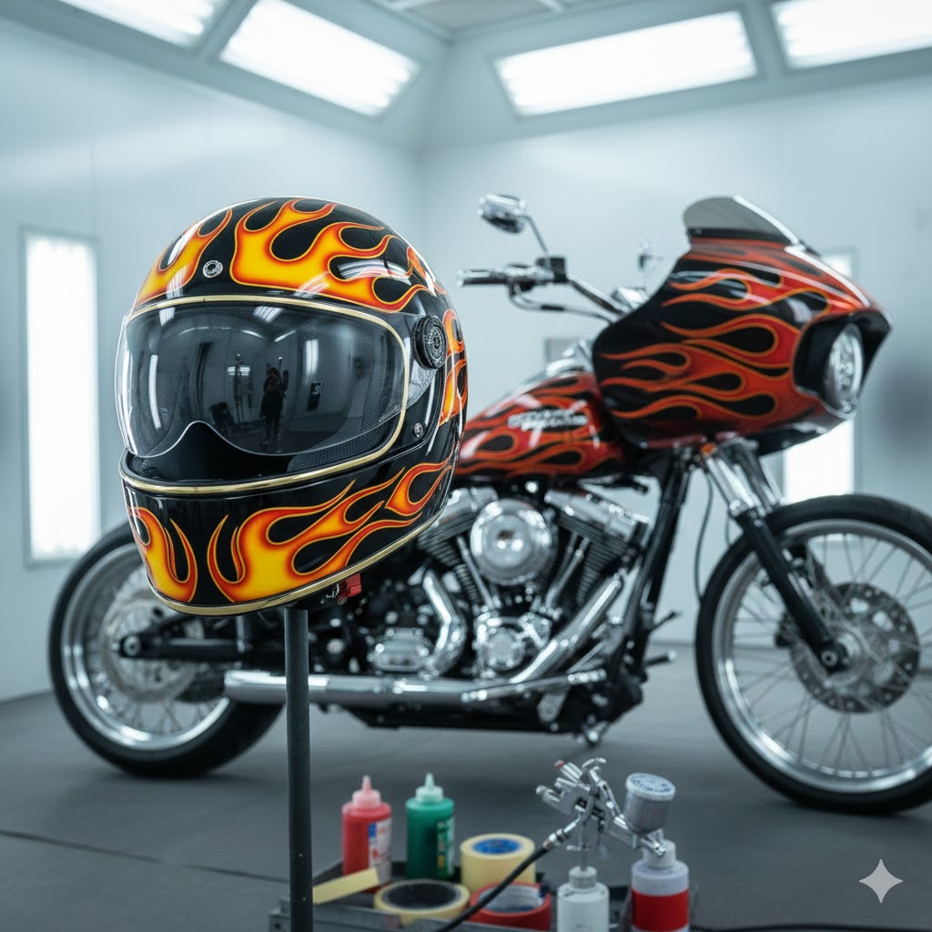 せっかくタンクやフェンダーをカスタムペイントして、世界に一台のハーレーを作るなら、もう一歩踏み込んでヘルメットも同じ色やデザインで統一(マッチペイント)してみてはいかがでしょうか? これこそが、カスタムペイントの醍醐味であり、究極の自己満足(褒め言葉です)です。