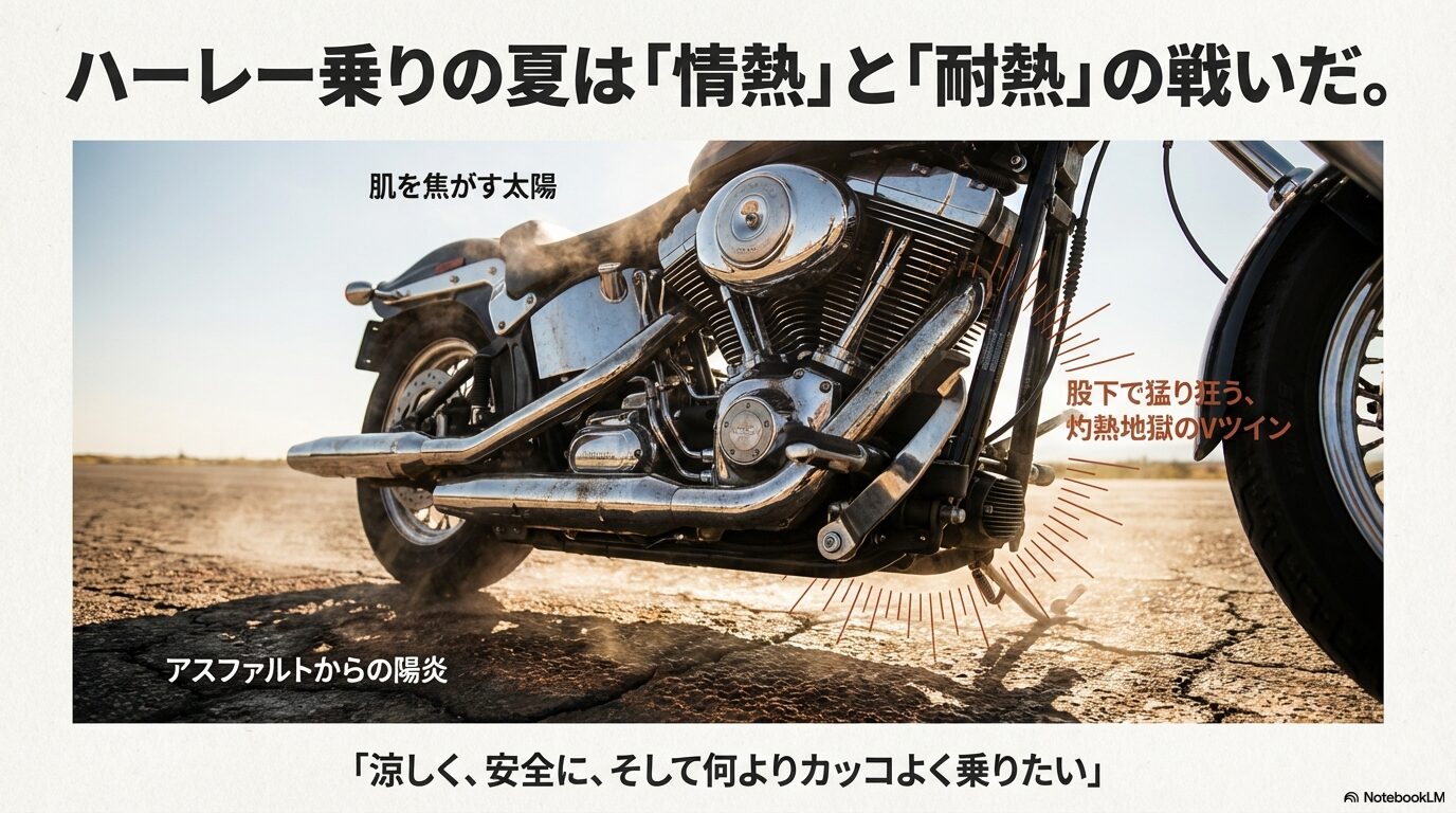 ジリジリと肌を焦がすような真夏の太陽、アスファルトから立ち上る陽炎、そして何よりも私たちの股下で猛り狂う空冷Vツインエンジンの灼熱地獄。ハーレー乗りにとっての夏は、まさに「情熱」と「耐熱」が試される季節ですよね。