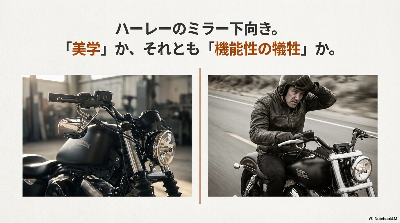 最後にまとめとなりますが、ハーレーのミラー下向きカスタムは、オートバイという乗り物が持つ「自由」と「自己表現」の象徴的行為です。その魅力は計り知れませんが、それは「安全」と「法規」という二つの基盤の上に成り立っているべきだと私は強く主張したいです。